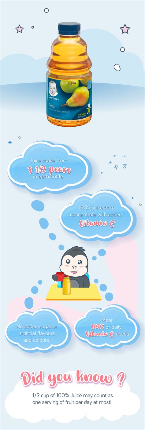- Monitor Intake: While Gerber Pear Juice is beneficial, it is important to monitor your child's intake. The American Academy of Pediatrics recommends limiting juice consumption to no more than 4 ounces per day for children aged 1-3 years and 4-6 ounces per day for children aged 4-6 years.